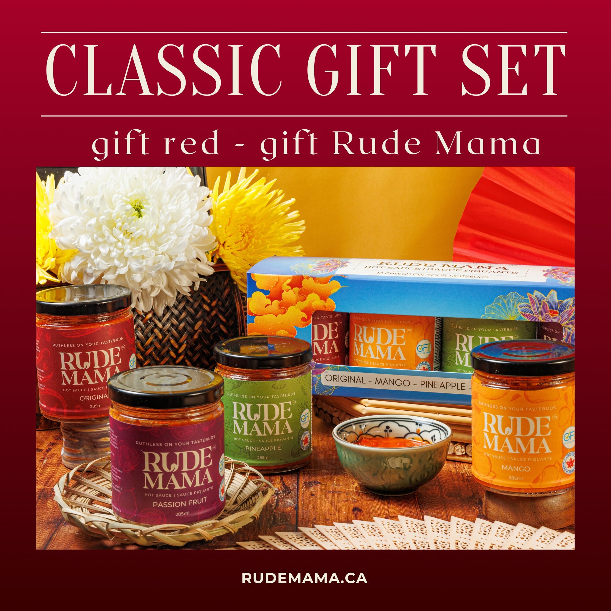 This gift set contains 4 different Rude Mama Hot Sauces (The Original, Mango, Pineapple, and Passion Fruit) and a witty yet sassy card for your beloved.